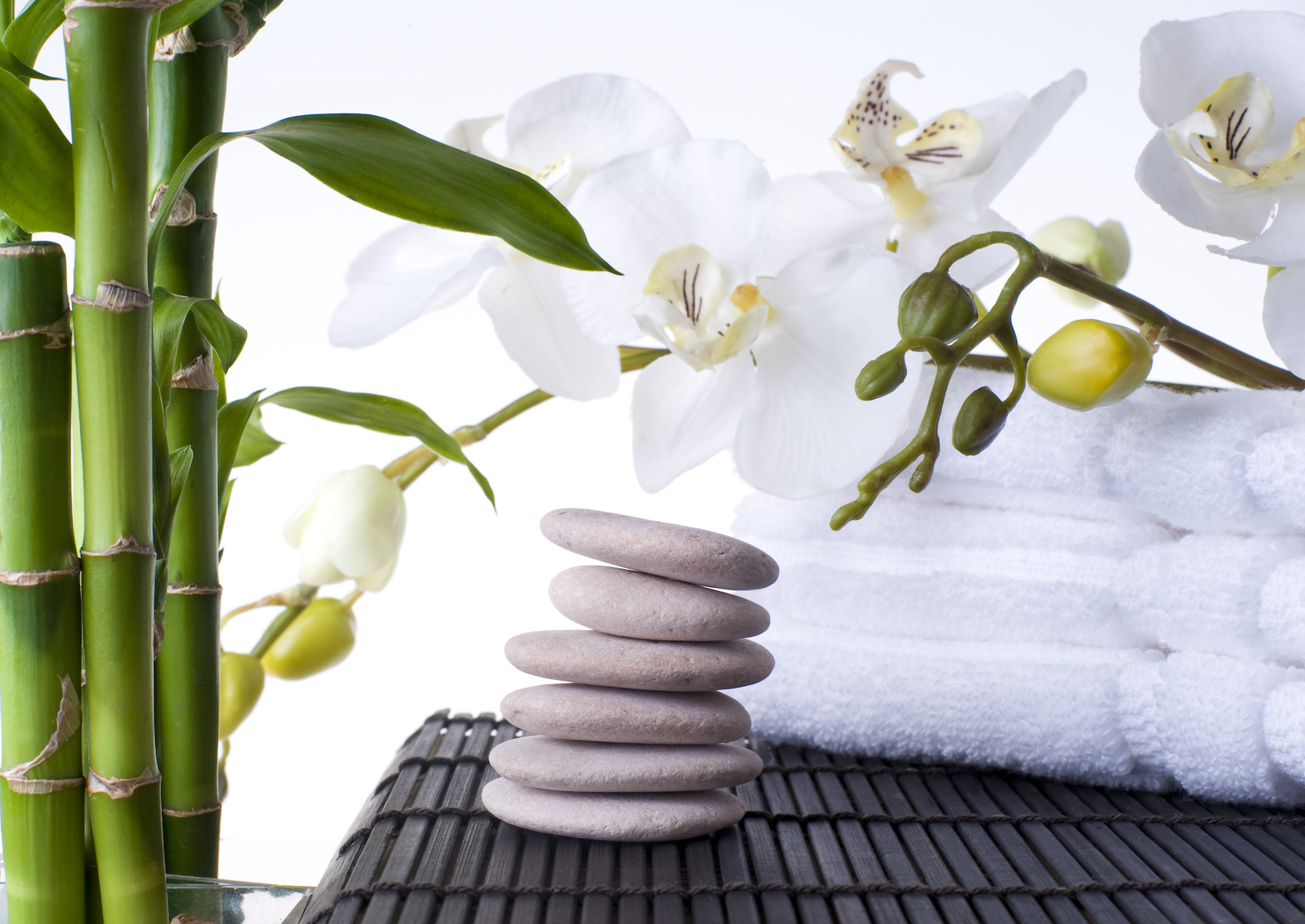 Afbeelding op acrylglas - Orchidee, zen stenen en bamboe