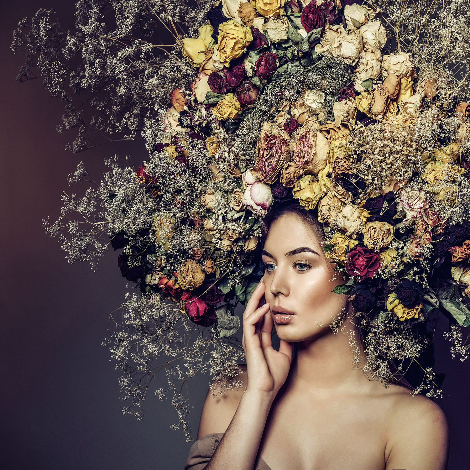 Foto Glas Art - Vrouw met gedroogde bloemen rond haar hoofd , 80x80cm, prachtig voor in de woon en of slaapkamer, inclusief ophang materiaal