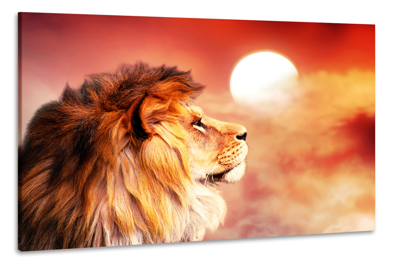 Schilderij -Leeuw oranje/rood, zonsondergang, 2 maten Premium print