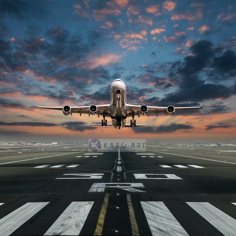 Schilderij - Opstijgende Vliegtuig , Multikleur , Premium print - 100x100cm